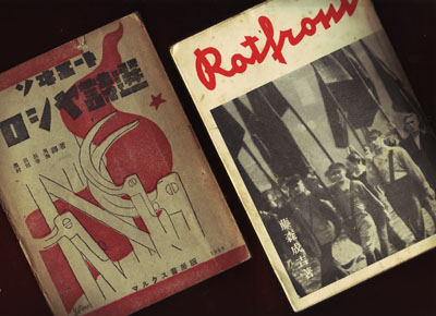 ■厳しい寒さにもってきて経済の先行き不安まで加われば、古本屋なんぞに出掛ける必然性など全くなく、それでもわざわざ―しかも限定された営業日に―ご来店くださるお客様に心の中で手を合わせながら、来週も店は火・木・土曜日の各日12時~20時で営業いたします。 ■最新の落札品から選んだ今週の新着品。先ずは上の画像、向かって右は1930年から1932年にかけてベルリンを中心に欧米に身を置いた藤森成吉の見聞と考察とを一冊にまとめた『ロート・フロント』。帰国した翌年にあたる昭和8年発行の初版です。著者・藤森が「半分グラフ的な本にしようと試みた」と記した通り、現地で自身が撮影してきた写真や持ち帰った資料からの転載など、本文内には図版多数。扱いは決して大きくありませんが、レイアウト、アレンジもなかなかのものです。渡航期間中、長く滞在したベルリンでは、当時、ドイツ共産党が台頭する一方でナチスが勢力を拡大していた時期にあたり、斜め読みした限りではありますが、ヒトラーとナチスの怪しさと民衆の熱狂など、結構生々しいレポートとなっています。世界恐慌後のアメリカと、疲弊したドイツとを比較した藤森の見方も興味深く、時代の転換期を捉えた知識人の記録として位置付けたい一冊です。向かって左『ソヰエート ロシヤ詩選』は昭和4年、その名もマルクス書房という版元から発行された初版本で、黒田辰男、村田春海、園田時子の翻訳によるアンソロジー。巻頭には、当時のロシアの詩人と詩壇に関する詳細な解説が収められています。鍬をデザインした装丁イラストの下の方には「katsue」のサインがあり、これはあのカツエさんによるものでしょうか。格差ではなく階級化の段階を迎えたともいわれる日本では、いまのところケータイ小説が売れているようですが、なぁーに次はプロレタリア文学でしょ!-というのはあり得ないでしょうねぇ。