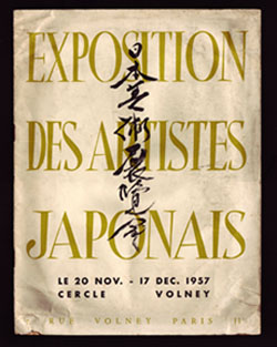 ■来週半ばまでに移動させるのを目標に、只今店内、「町工場」展の在庫品整理で古本屋とは思えぬ様相を呈しておりますがしかし。店は来週も火・木・土曜日の各日12時~20時で営業いたしますので、皆様にはご来店のほど御願い奉ります。 ■単行本や雑誌などをおよそ30~45cmくらいの長さで紐で縛り、それを1本から複数本一緒に市場に出品されたのを指して古本屋は「本口(ほんぐち)」と呼びます。いま手元にある昨日の落札品一覧から数量を示す部分を抜書きすると…1本口、3本口、2本口、2本口、1本口、1冊、5冊、2本口、2冊…そうです。今週落札したのはほとんどが「本口」。この内「1冊」とあるのは当新着情報に相応しく込み入った説明を要するのですが、何しろ厚さ約8cm・鉄製ビス留めとあってその重量から持ち帰るのにビビり(今年は疲労骨折もありましたし)、「5冊」は雑誌『domus』の1950年代発行分の“合本” でこちらもやはり非情な重さ、「2冊」は基本図書のようなもの、あとは白っぽいところ・黒っぽいところいずれも長い説明など要するまでもなく。「どうするよ。新着品。」(古本屋なんですからね。「本」を買うのはとーぜんでしょう。なのにそのとーぜんに困るというのは一体何だ。)というわけで。今週の新着品は少しの間自宅で出番を待っておりました“珍品”を代打に起用いたしまして先ず最初。『EXPOSITION DES ARTISTES JAPONAIS 日本美術展覧会』は1957年、パリのギャラリーで開催された日本美術に関する展覧会の目録です。名誉会員にはジャン・コクトー、ジャン・カスー、藤田嗣治、古垣鉄郎ら、実行委員会には浜口陽三、荻須高徳、堂本尚郎らの名前が並び、中途半端な展覧会ではなかったであろうことを思わせます。仏文のリストによれば「平面」で今井俊満、桂ユキ子、野見山暁治、荻須など55名92作、「版画」で長谷川潔、浜口、南桂子の8作品、「彫刻」「書」をあわせると全107点の作品が出品されています。また、古垣、藤田、コクトーは招待作家として出品もしたようです。序文は古垣、彼の地では「SATOMI」で充分名前の通っていた里見宗治が表紙を担当しています。日本美術といってもありがちな古美術・浮世絵に非ず、むしろ当時の日本の先端・前衛もしくは気鋭の新人を紹介しようと目論んだものらしいことは一目瞭然といえるでしょう。敗戦後わずか7年で、世界の美術の動きに遅れることなく前進していた若き芸術家たち、それを支えた人たちの気概には、どこか感動を覚えます。日本の芸術家たちが憧れてやまなかったパリで開催されたこの展覧会が、日本の若い作家たちに、フランスの美術批評家や愛好家たちに、果たしてどのように受け止められたのか。少なくとも当時すでにパリの日本人美術家たちと親密に交流していた(個人的に最近俄かに興味をもつに至った)海藤日出男あたり、どこかに何か書いているに違いなく、しかし何分にも突然の代打につき準備不足、そのあたりについてはまたいずれ。