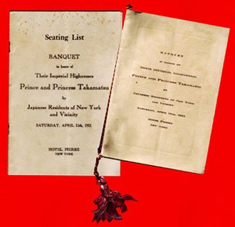 ■さて次の代打はアメリカからの起用。『BANQUET in honor of Their Imperial Highnesses Prince and Princess Takamatsu by Japanese Residents of New York and Vicinity』、即ち高松宮宣仁殿下&喜久子妃殿下を囲んで行われたパーティの出席者名簿と晩餐メニューの一揃い。1931(昭和6)年4月11日(土)、ホテル・ピエールで開催された際に出席者に配られたものでしょう。画像では判然としませんが、紅白の房のついたメニューの用紙には極控えめに木の葉の地模様があしらわれ、端整な佇まい。しかし何といっても圧巻は「Seating List」。殿下&妃殿下とともに上座に控えたN.Y.総領事・堀内謙介、高松宮付別当・石川岩吉、海軍少佐・水野恭介といったお歴々以下、9人着席のテーブルで45台、従って総勢約400名のセレブの方たちの氏名が肩書き付きの欧文・アルファベット順と着席テーブル順との二通りでびっしり並んでいます。圧倒的に多いのが日本人の「Mr」諸氏。夫人を同伴していないのはいかにも日本人らしいところ。一方、意外に多いのが「Miss」の方々で、一体どういうお嬢様たちなのかはセレブと全然無縁な私には想像もつきません…とか何とか書いてみたところで「だから何?」といわれてしまえばミもフタもなく、けれど『高松宮日記』などちゃんと資料に目を通しておけばもう少しまともなことも書けたのではないかと、凡打で終わった代打がそう申しております。今週は代打二点、どうもハンパで砕け散った感がありますが、ともにおそらくは二度と手に入ることのない“珍品”ではあろうかと。 ■残る「本」のなかには、帯欠けながら亀倉雄策装丁=デビュー作となった戦前の第一書房版『夜間飛行』、こちらは函欠けではありますが東郷青児翻訳・装丁の『怖るべき子供たち』、恩地孝四郎風の装丁で大木惇夫の『危険信号』、牧逸馬訳の『バッド・ガール』、よく見ないと何が出てくるか分からないゴッタ煮状態の1930~50年代の洋雑誌2本分などがあり、これらも来週中にはぼちぼち店に出す予定です。あああっ。本といえばもう一冊。岡崎武志さんの新刊『女子の古本屋』が届きました。来週には書店に並ぶそうです。“女子”と呼んでいただくにはトウの経ちすぎた日月堂もご紹介いただいているのですが、小店のところはあっさりスッパリすっとばしていただいて、古本界で奮闘する頼もしき女子たちのおはなしに、耳を、もとい目を向けていただければ本当に嬉しく、どうかよろしくお願いいたします。
