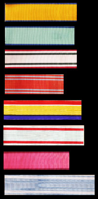 ■ずらずらっと並べてみましたリボンの画像(現物をスキャンし、並び・背景を加工)は、こちらも今週の新着品。布装のアルバムに絹平織りのリボンを貼り付けた、「綬」の見本帖です。「綬」というのは即ち「リボン」のことではあるのですが、そこいらのプレゼント用のとは違って紫綬褒章など褒章授与の理由により色を変えて使われるものなのだとか。この見本帖についてはこの「綬」が並んでいるだけで、来歴・由来など手掛かりの一切ない、解説書くには実に困った物件なのですが、アルバムの体裁や紙から昭和初期頃までの時代のもので、綬の種類が118点と多様なことから、おもに軍隊にまつわる褒章を誂える業者が自店内で使うために用意していたのものではないか?と見ています。118点のなかには、それこそスキャパレリのようなショッキング・ピンクを大胆に使ったものや、オレンジ&ブルー&グリーンのストライプなんていう南仏テイスト、真っ黄色&真っ赤で無闇に幅広・インパクト大な代物などもあって、先のランバンなどとはおよそ対極のアノニマスなデザインですが、しかしこちらも相当お洒落です。軍服とは無縁な時代を、褒章などとは無縁に生きたい-望んだところで無理!-と思い、歴史を顧みるに軍服が格好いい時は要注意だと分かっていながら、しかしこの「綬」のセンスを認めないわけにはいかないのでした。それにしても、歴史(小店の)を省みるにアノニマスなのは売れないと痛いほど分かっていながら……どーしてなぜに。あなたは買ってしまうの(単なる馬鹿ですな)。深く反省するのは後にして新着情報を続けますと、既述の洋雑誌各種をはじめ、今週はこの他にも戦前の『松坂屋・秋冬の流行』(木版多色刷りの着物図案各10葉・抽象柄含む)2冊、1950年代に絵葉書の業界団体が発行した現物貼り込み多数の年鑑『日本絵画趣味紙工品通信』4冊、明治期の手札写真などのまじったダンボール1箱分の『紙ものいろいろ』、そして何故か『矢内原伊作書簡』1通などが新着。また、これまで手を付けずにいたフランスのアール・デコ期の石版多色刷り図案リーフや『高島屋百選会』等着物図案集なども店先に。この新着ご案内で二回前の靴のカタログなどと合わせると、俄かにファッション関係のアイテムが充実してきたようです。これで店内にも春の明るさが…はなにあらしのたとえもあるぞ by井伏鱒二…そう簡単ではないものの…書を捨てよ、町に出よう by寺山修司…ともあれみなさま桜は見頃をはずしませんように。時こそ今は!