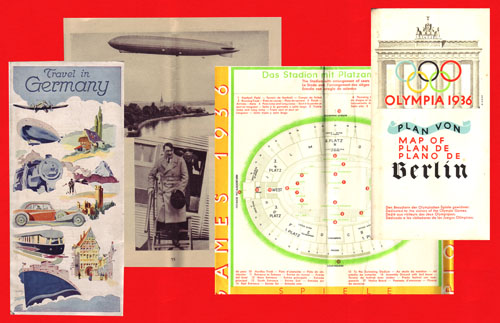 ■昨日の「洋書会大市」でもお陰様で何とか落札叶い、新着品はそのなかからいずれも戦前ドイツの観光案内から。向かって左の2カットは1934年発行『Travel in Germany』、右側は1936年ベルリン・オリンピックの際にドレスデン銀行が用意したオリンピック施設を中心としたガイド用冊子兼地図『OLYMPIA 1936 PLAN VON BERLIN』。前者は英語、後者は独英仏伊の4ヶ国語の併記となっています。左側のガイドはアメリカを対象に単に観光だけでなくリゾート需要の掘り起こしを目論んだものか、音楽祭や演劇、登山や南仏へのドライブなどにも言及。当時ベルリンとフリードリヒスハーフェン間の定期便運航にあたっていたグラーフ・ツェッペリン号(LG127)や、飛行船から降りてくるヒトラーの姿まで動員して富裕層向けのPRに努めた模様。この当時、フランスほどではないにしろ、ヨーロッパではナチスに対する厳しい目も注がれていたことを考えると、とくに経済的には蜜月関係にあったアメリカに外貨獲得の活路を見出そうとしていたものでしょうか。一方、オリンピック・ガイドでは各種施設の配置図などもあり、これまで扱ってきたベルリン・オリンピック関係のガイドと比べてもかなり詳細な上、まるで刷込み効果を狙ったかのようにあらゆるスペースを使って「DRESDNER BANK」をPR。ベルリン・オリンピックが国家的プロパガンダにそれこそ総動員されたことは周知の通りですが、その下の組織=企業もまた国家の似姿には違いありません。今年、中国で開催されるオリンピックは、さまざまな紙の上に一体どういう痕跡を残すのでしょうか。 ■「洋書会」ではこの他、少々調べに時間がかかる戦前のシュルレアリスム関係洋雑誌、パリ万博写真集、広告専門誌など。来週以降の「新着」でまたご案内いたします。来週金曜日は搬入直前につき、新着情報は今週同様少し早目のアップを予定しております。といったところでまた「紙モノ」作業の続き。こちらは即売会でお楽しみいただけますよう…。