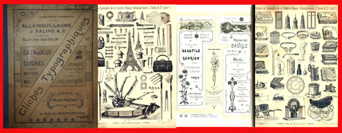 ■とりあえず「雑書目録」に新着品をアップしつつあるものの(乞ご高覧!)、今週も山成す紙モノには手も付けらず、棚の入れ替えもままならず、何でそんなに忙しかったのかというと具体的に思い浮かぶこともなく、どうも即売会後の虚脱状態が続いていけません。そろそろエンジンを全開にして、来週も店は火・木・土曜日、各日12時~20時で営業いたします。呆れず懲りずお付き合いのほどお願いいたします。 ■ついこの間、ペニョ社の総合カタログがようやく嫁入りしてくれたばかりだというのに…またしても売りにくいものを買ってしまったフランスの印刷会社の総合カタログ。といっても、本日落札いたしました『Cliches Typographiques』は日本で「花形」と呼ばれていた活版印刷に使われる装飾的図版だけを集めたカタログだというのが面白いところ。厚さ約3.5cmの上製本の体裁をとっていますが、途中で紙質やデザインの傾向の異なるページが追加・製本された痕跡があり、刊期の記載はないものの、20世紀の初め頃から少なくとも一定期間にわたり大切に使われていたものと想像されます。図版はアール・ヌーヴォーの優美な飾り罫多数、日用品、ファッション小物各種はもとより工具、農具、聖書のモチーフや動物・植物まで、「ないものはない」と思わせる収録数、即ち「つかいで」たっぷり。加えて例えば、自転車の図版がかなり多めなのは当時流行していた(はず)だからだし、コロニアリズムを背景としたものか有色人種の図版が見られるなど、ここにもしっかり時代が刻印されていて……と、このへんにしておいて、つまりはどう見る・どう使うかはアナタマカセの一冊というわけです。