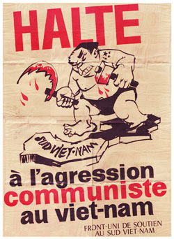 お陰様で落手した『精神生理学研究所』は1970年の8月1日(落札日と同日だ!)、「東京精神生理学研究所」の発行。編集者は竹田潔、島村清治、稲憲一郎の3名。この研究所は、総勢15名の同人が指定された日時に「同時多発に行為あるいは無行為をもって参加する不可視的美術館」の名称で、指定された日時に行われた行為または無行為=「アクション」の報告書がこの落札品。リーフのなかには白紙もあって「無行為」までもが几帳面に報告されています。もちろん、「行為」の方はアナーキーからコンセプチュアル、あまりに日常なのものやいっそナゲヤリなのまで何でもあり。赤瀬川描いたところの生々しさは当品紙面ではいささか削がれた感はありますが、あの時代の物的証拠のひとつを我が手にすることができました。と、ここまで書いておいて本当に心苦しい限りですが、当品については1年以内を目途に発行を考えている自店目録発行まで、しばし手元に留め置かせていただこうかと。目録が計画倒れにならないように宣言を兼ねてのご紹介、どうか悪しからずご容赦のほど…。 ■日本の美術界が奇妙な沸騰を見せていた時代は世界的に政治の季節でもあったわけで(このあたり我ながら強引な繋ぎっぷり)、フランスからこんなものを。ベトナム戦争当時のプロパガンダ・ポスターです。1960年代、パリで印刷されたもの。メッセージの発信元はどうやら南ベトナムの支援団体で、「共産主義者のベトナム侵略を食い止めよ」といったメッセージです。気になるのはこの図案、文字を日本語に置き換えると「まんま柳瀬正夢…」と思うのは私だけでしょうか。というより、世界中、いつの時代も何故プロパガンダ表現はこうも似てしまうのか、よぉーく考えてみると不思議です。赤と黒、荒々しく力強い線、視線を右上がりに誘導する構図等々、いってみれば「プロパガンダ様式」。これって一体いつ、どこで、誰が“発明”したものなのか、根っ子の部分が気になってきました。どこかに『プロパガンダ様式』という研究書はないものでしょうか。それにしても。振り上げる拳の先が、拳を振り上げる者より必ず大きな存在だった時代が-例え街中にポスター貼ろうが全裸で疾走しようが-心底健全に思える只今現在というのは一体…と長くなるのでこのへんで。今週はこの他、柳澤健著『紀行世界図絵』、柳亮『巴里すうぶにいる』等欧州紀行関係書5冊、『違星北斗遺稿 コタン』(昭和5年・元版)、何やら混沌とした紙モノがダンボール一箱入荷いたします。「雑書目録」には只今展覧会の目録を随時アップ中。こちらも併せてよろしくお願いいたします。