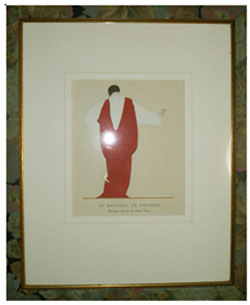 ■暑さに加えて時に命の危険を感じるような雷雨。加えてオリンピックも開会。古本どころではない時節-というのを言い訳にして、明8月9日(土)、12時~20時で営業した後、8月10日(日)~15日(金)は店、ネットとも夏季休業をいただきます。どうかご容赦のほどお願いいたします。8月16日(土)からは通常の火・木・土曜日の週三日・各日12時~20時で営業いたします。ご来訪を心よりお待ちいたしております。 ■先週のダダカンから一転、今週の新着品一点目はエレガンス極まりない額モノ。ポール・ポワレの“マント・デュ・ソワール”をジョルジュ・ルパップが描いたファッション・プレート。額の裏側がテープで塞がれているため、プレート自体を確認できないのですが、キャプションの書体、プレートのサイズや紙質などから見て『ガゼット・デュ・ボン・トン』に収められていた一枚と見て間違いないでしょう。額の裏が開けられないのは困りもので、デジカメではこれが限界でしたが、実際にはこの画像の数十倍素晴らしい…赤と白と黒との目にも鮮やかなコントラスト、ゆったりとしたローブの流れを描いた繊細な線と極淡い白を刷いて表された模様、ローブと同じ赤の差された爪先等々…のは、やはり現物をご覧いただくしかありません。そこまでいうなら額からはずしなさいヨ、とはご尤もなのですが、ステンシルで彩色されたシックな花模様の額、溝をあしらうことでより立体的に見せるマットと、今回に限っては額装自体捨てがたいものがありまして悪しからず(ホントに手を抜いてるんじゃありませんてば)。ポワレ&ルパップという最強のタッグマッチとはいえ、フランスは1920年代にしてこの洗練。横目で見た2008年オリンピック日本選手団のユニフォームは……遥かな時を経ていまやカワクボ、ヨージを擁するに至った国としてはいかがなものかと思うのは私だけでしょーか。ヘルツォーク&ド・ムーロンは中国でもカッコいいけど。