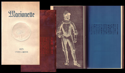 ■先ずは簡単なご案内。準備の進む「Open-House-Market」から、村上邸・鈴木邸とも商品を中心に明日中に新たな画像をアップいたします。左の企画展の下にあるアイコンをクリックして是非チェックを(文末レポートもご笑覧ください)。今回、お申し込みいただかない限り、現地には辿り着けない格好となっておりますのでご注意ください。また、店は来週より通常に戻り、火・木・土曜日の各日12時~20時で営業いたします。お散歩には絶好の季節、ご来店いただければ幸いです。 ■大市の結果は時間的な問題があって来週とさせていただいて、今週の新着品からは先ず『Marionette マリオネット創刊号』。上原誠一郎という人を発行者に1971年、限定150部(内50部は刊行者本)が発行された同人誌です。一見エンボスに見える表紙は「銅版画」とする記載があり篠原佳尾の作品、巻頭には銅製の薄いシートに印刷された瀧口修造の小文「人形銭」が置かれ、執筆者には種村季弘、富岡多恵子、笠井叡、そして戦前にやはり『Marionette』という同人誌を主宰していた南江治郎(詩人で人形劇作家。ずぅーっと気にしているのになかなか全体像が掴めない人)らが名を連ね、クライストの「人形芝居」の翻訳があり……と何とも贅沢な内容なのに、限定150部の同人誌ってナンダこれ。一体この発行者は何者だろう。私、無粋なことに下戸なもので全く知らなかったのですが、日本酒には「越後鶴亀」なる銘酒があるそうです。醸造元は新潟の上原酒造、そこの五代目を継承している人こそが発行者・上原誠一郎氏。「マリオネット宣言」なるマニフェストを掲げた正統アヴァンギャルドの結構を整え、内容としては“人形-身体-速度-引力”といった極めて今日的なテーマの連関で構成された同人誌『マリオネット』から日本酒の世界へ! デジタル情報が網の目のように張り巡らされていない限り、絶対にたどり着けない結びつきでした。上原誠一郎という方、芸大を卒業後1976年に渡伊、アンジェロ・コルティに師事、コメディ・デラルテを学び、以降14年間、俳優・演出家としてヨーロッパ全土を中心に公演活動したという経歴をお持ちのようですが、イタリアに渡る以前、すでにこんなとんでもない同人誌を作っていたというわけです。栴檀は双葉より香し。さらに検索してみると、今夏、上原酒造は「清聴せよ 大吟醸」限定20本という商品を発売しているのですが、これがまた森村泰昌との“コラボレーション作品”なのだとか。上原氏、まだまだ意気軒昂と見ました。