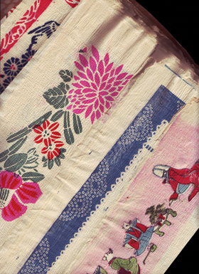 ■次はひさぁーしぶりの紙モノ新着です。本日の落札表で何と記されているのか改めて見ると『定見本四十枚』と。これでは何だか分らない。要は手製の見本帖なのですが、何の見本かというとですね。およそ42cm四方のちりめん和紙(手揉みで細かいシボを入れた柔らかい和紙)の中央部分に白を残し四方を囲むように木版多色刷図案が配置されているものばかりを集めたものなんですが…「だから何。」「そうですよね。」買っておきながら、正直にいいまして、これが……分からない。四方にレースを模したのなど見ると、テーブルナプキンのようでもありしかしそれにしては大きく、図案にはめでたそうなのや季節感を取り入れたものが多いので引き出物を包むのに使ったようにも見えるのだけれどそれにしては紙が薄くて心もとない。ランチョン・マットにするにはこれまた大きく、真ん中の“あえての白?”も意味不明。「鼠の嫁入り」はまだ普通、「蛙+亀+蟷螂」(コワカワイイ) 「紅葉+蜘蛛の巣」(不気味)果ては「猿蟹合戦+桃太郎」(変)「東欧フォークロア+絞模様」(何処から来たんだ)という図案も謎といえば謎。いままで結構な種類の紙モノを、洋の東西ばかりか南北をも問わず扱ってきたつもりでしたが、ここまで分からないといささか自信をソーシツします。世界の金融危機よりも、この分からなさによる動揺の方が応える小店って-まだ資本主義以前。確かに。今週の新着品のなかではフランス文学者宛ての私信類(多田智満子多数、朝吹登水子多数、矢内原伊作5通、柳瀬尚紀3通他、渡辺一夫、江藤淳、中村真一郎等) も面白いのですが、これはご紹介までいま少しお待ちください。あっ。松澤宥『プサイの函』も再入荷です!