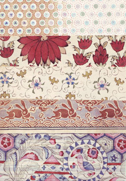 ■もう一点は入札用の封筒に「千代紙」と書かれていた一口。更紗模様の千代紙は珍しい…と眺めていると、千代紙でよく見られる木版とは色ののり方も紙質も違う。ならば何か。とまるで先週の続きようですが、色面の面積の比較的大きなところに残る刷毛目や顔料の“たまり”などから木版ではなくポショワール=ステンシルによる彩色と判断。50点を上回る図案を総合的に見て、これはテキスタイル・デザインの見本=お手本にあたるものではないかと推測。さらに細かく見ていくと、社名の入った手ぬぐいの図案があるし、とうとう「東京・京橋 ちどりや染物店」の案内状も出てくるし、どうやらこの染元さんが保存していた見本と見て間違いないでしょうね。先週の謎は依然として解けずにおりますが、今週は無事、腑に落ちてくれました。図案は洋でもなく和ともいいきれず東西がいい具合に混じりあい落ち着いた色彩も見事、彩色は非常にきめ細かく、いずれもハイセンスかつ丹念な仕事の跡を留めていて、こちらもまた画像だけではお伝えしきれない現物だけのもつ力に溢れています。一人で盛り上がって下札での落札でした。分からなくても買ってみる。現物と向き合う。その時に「私」が受け止めた見込みや感嘆に値を付ける。奇しくも今週の新着品は、そうした買い物例を並べたようになりました。ものを知らないことは、とりわけ古本屋という立場からしてとても恥ずかしいことですが、それでもなお、古本屋の力を養うのはそんなことの積み重ねでしかないのではないかと思います。かくして毎週金曜夜の格闘は古本屋である限り続く……のでしょうか。やれやれ。今週はこの他、20世紀初頭~1920年代頃までのパリを中心とした欧州観光写真集十数冊(内パリの一冊は皮装)、美術・芸術論考書籍15冊、戦前の印刷技術関係書などが入荷いたします。来週月曜日は鈴木邸の最終準備。みなさまのご来…くどいって!