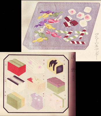 ■がらっと趣が変わります。昭和11年1月1日、限定500部発行『国菓図鑑』。いわばお菓子のデザイン図版集といったもので、全頁綺羅引き和紙使い、木版多色刷35図を所収。図版の細部にはさらに手で彩色を施した跡が認められます。またそれぞれ菓子銘と簡単なレシピが記されているのですが、銘とデザインとを対照して見れば、日本人が元々もっていた抽象化に長けたデザイン能力や季節感を簡潔に表す言語能力に感心し、材料を見れば苺羊羹に昆布羹、引茶羹あればこれって何だろハツタイ羊羹と、「羹」がつく素材だけでその種類数知れず、その全てをできることなら味わってみたいものだと思い、こちらはもう何の理屈も文句もなく、ただひたすら眼玉と脳とを楽しませてくれる一冊です。画像は35図のうち、「フルーツキヤンデー」の頁と里錦、藤影、春野といった銘の並ぶ「流し物 その一」の頁です。画像にはあえて採りませんでしたが、巻頭の「千代の縁」の意匠は圧巻。今週はこの他、岡本潤詩集『罰当たりは生きている』から、江戸後期の紋帳4冊、名もなき一般人の戦前の写真一袋、戦前アール・デコ期の壁紙現物見本帖4冊、いまや文房具屋さんに行っても手に入らない古い未使用の住所録、名刺ホルダー、出納帳等まとめて一括などが新入荷。また、来週月曜日には追加の落札品(本中心となるはず)も判明する予定、こちらはまた改めて。