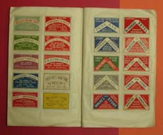 ■新着品のご紹介を少々。上の画像は『LIVRE D'OR DE BIBLIOPHILE 1928-1929』。“愛書家のための輝かしき本”とでも訳すのでしょうか。1929年、パリで限定1800部発行されたこの本は、愛書家が所有するに相応しい本の数々からフロント・ページと挿絵を「いいとこどり」して一冊にまとめたものです。挿絵は元本の手法を踏襲していて、マルティ画のポショワール、マリー・ローランサンのリトグラフをはじめ、当時の人気挿絵家・画家の小口木版、銅板画など、いわゆるオリジナルが多数綴じこまれた、実に贅沢な本となっています。そして下の画像。手製ノートの表紙に『燐葉集』と毛筆書きされたマッチラベルのコレクションです。海外モノが多数を占めるコレクションは意外に少ないのと、その並べ方に感心しての落札でした。これを見ると、マッチラベルのデザインが統一フォーマット+オーダー部分で成り立っていること、オーダー部分の工夫次第で充分個性が出せることなどがよく分かります。デザイン・ソースとしてみても魅力的な一冊です。