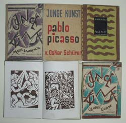 ■今年に入って仕入れに出向いた市場は4回。気付いてみれば買ってました。これが結構。もちろん商売ですから買ってる分より売れてる方が多くないと商売も生活も成立しません、そのはず。なんですが。ああら不思議。すでに買ってる方がすっと多い……と気付いて俄かに浮き足立ち。そのせいで今週は新着を二回に分けてご紹介いたします。もちろん営業ご案内も=今週も火・木・土曜日12時~20時営業いたします。店とネットが命綱…どうか共々よろしくお願いいたします。 ■新着その一の①:『JUNGE KUNST』はそのタイトル通り「新興芸術」をテーマに据え、1919年よりドイツで刊行が開始されたシリーズ(叢書)です。2001年に出した自店目録「特集・20世紀都市のエレメンツ」で、この中のアーキペンコをご紹介して以来、なかなか再会できずにいた本でした。今回入荷したのはこの叢書中の15冊。A5版の薄冊、ハードカバー。装丁は表紙から裏表紙にかけて厚紙にダイレクトに印刷されており、カバーなしで完本。編集は一作家一冊主義、ドイツ表現主義やダダなど新興芸術の新星たちを取り上げています。いずれも巻頭に当時の美術評論家の作家批評とカラーの口絵1点(作品)を置き、頁数のほぼ三分の二は作品で構成されます。どの本も表2に日付と“丸ビルにて”などの書き込みがあり、1920年代に日本人が買い集めて(欧文署名がありながら達筆過ぎて読めず)いたもの。今回入荷したのはゲオルグ・グロッス、パウル・クレー、ピカソ、ドラン、ローランサンなど。いまは無名作家の作品に至るまで、当時の新興芸術の果敢な精神、或いは時代の陰鬱な空気を伝えてくれる、貴重な叢書です(ばら売り)。