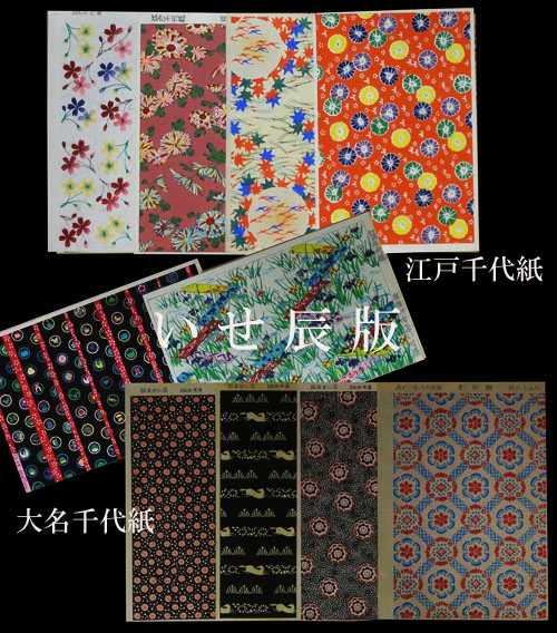 画像下段の4点、つまりは小店店主好みだというその地味な方ですが、「大名千代紙」というシリーズ名で作成された いせ辰さんならではのオリジナル。 商品に添えられた解説によると、江戸後期に活躍した浮世絵師・渓斎英泉が、武人が身につけた武具=都久利加波の意匠から気になったものをスケッチ。それを集成し木版手摺りの私家版にした『革究図考(かくぜんづこう)』に基づき、新たに千代紙として復元したものだと云います。都久利加波というのは、なめし皮に菖蒲=勝負の葉の煮汁などで運長久を願う図案を染めたもののことだそうで、その図案を継承した「武士の千代紙」であるこから、大名千代紙と名付けたのだとか。なかにはまるでオランダ更紗のような柄・色使いのものなどもあり、大名千代紙、飛びぬけてモダンです。